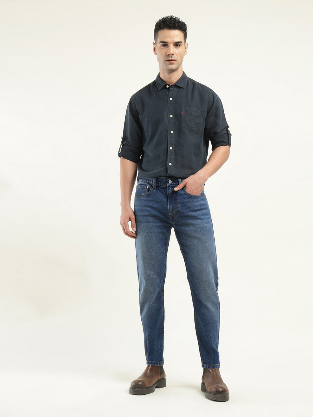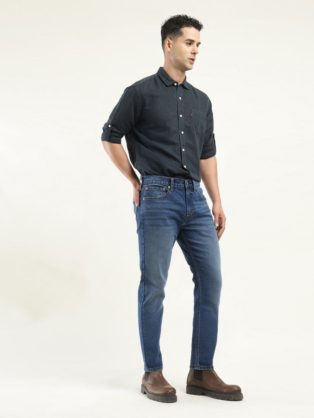 Everything you like about 512 Slim, but updated with a narrow fit through the thigh and tapered leg for the fashion-forward guy. It's perfect for the modern look right now. This pair has just the right amount of stretch for all-day comfort and comes in a blue hue with the classic 5 pocket and cotton material. Style it with our classic shirts and a pair of sneakers to complete your casual look.