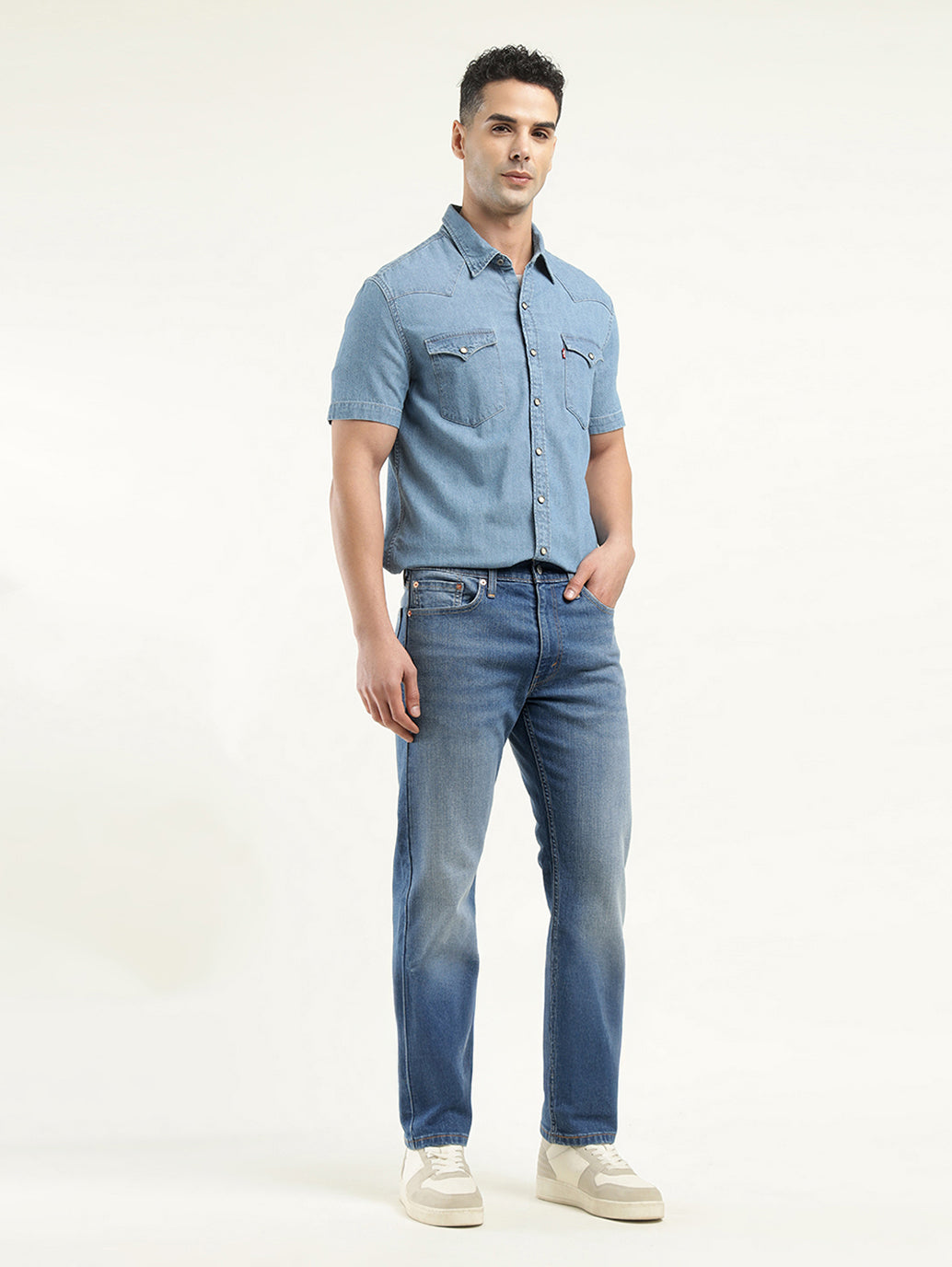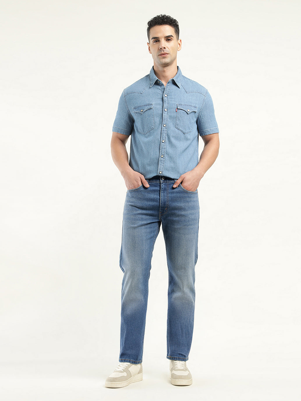 Iconic Style has met comfort. A fit that's not too baggy/relaxed and not too slim. The Levis 513 Straight fit is versatile and gives a streamlined silhouette. Wear them with a t-shirt or buttoned shirt, either would work. These blue jeans with a dark shade are made of cotton and will stay durable providing exceptional ease of movement and wearing comfort.