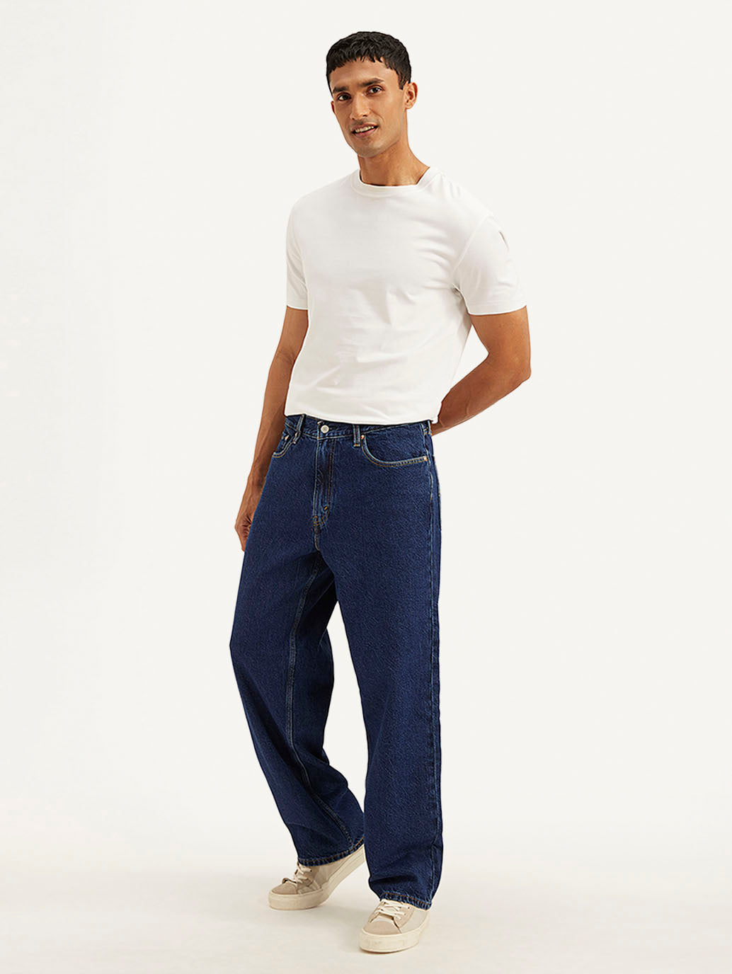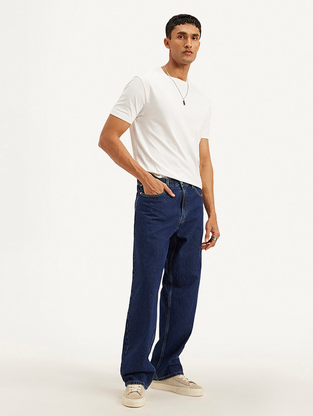 1. Classic baggy jeans in a navy shade 2. Pair it with our graphic t-shirt for a casual outing