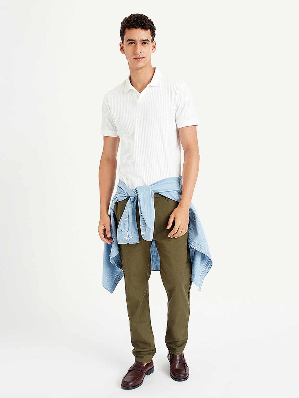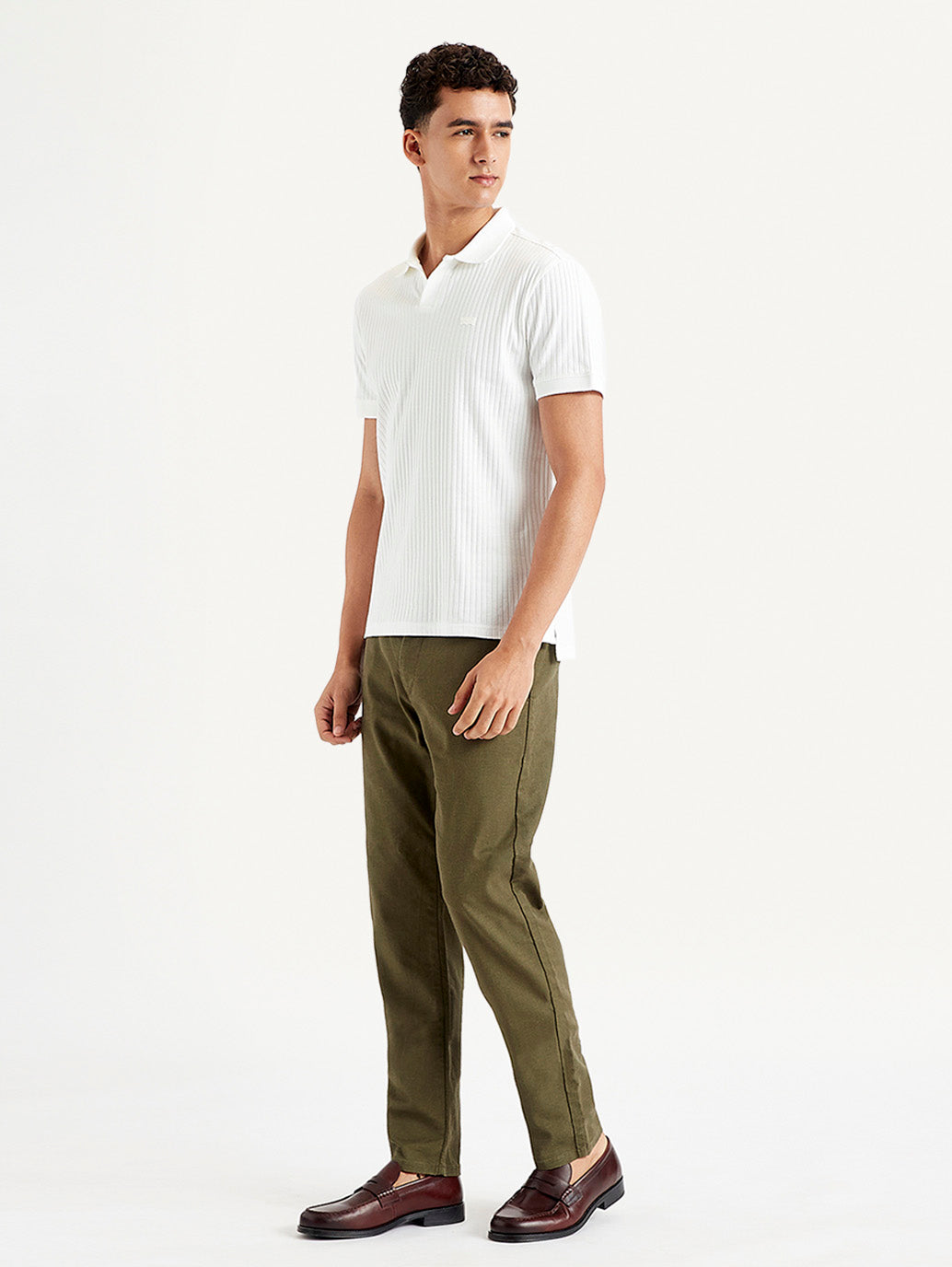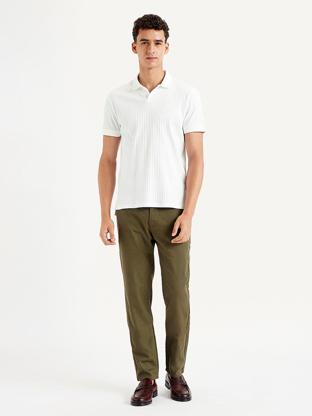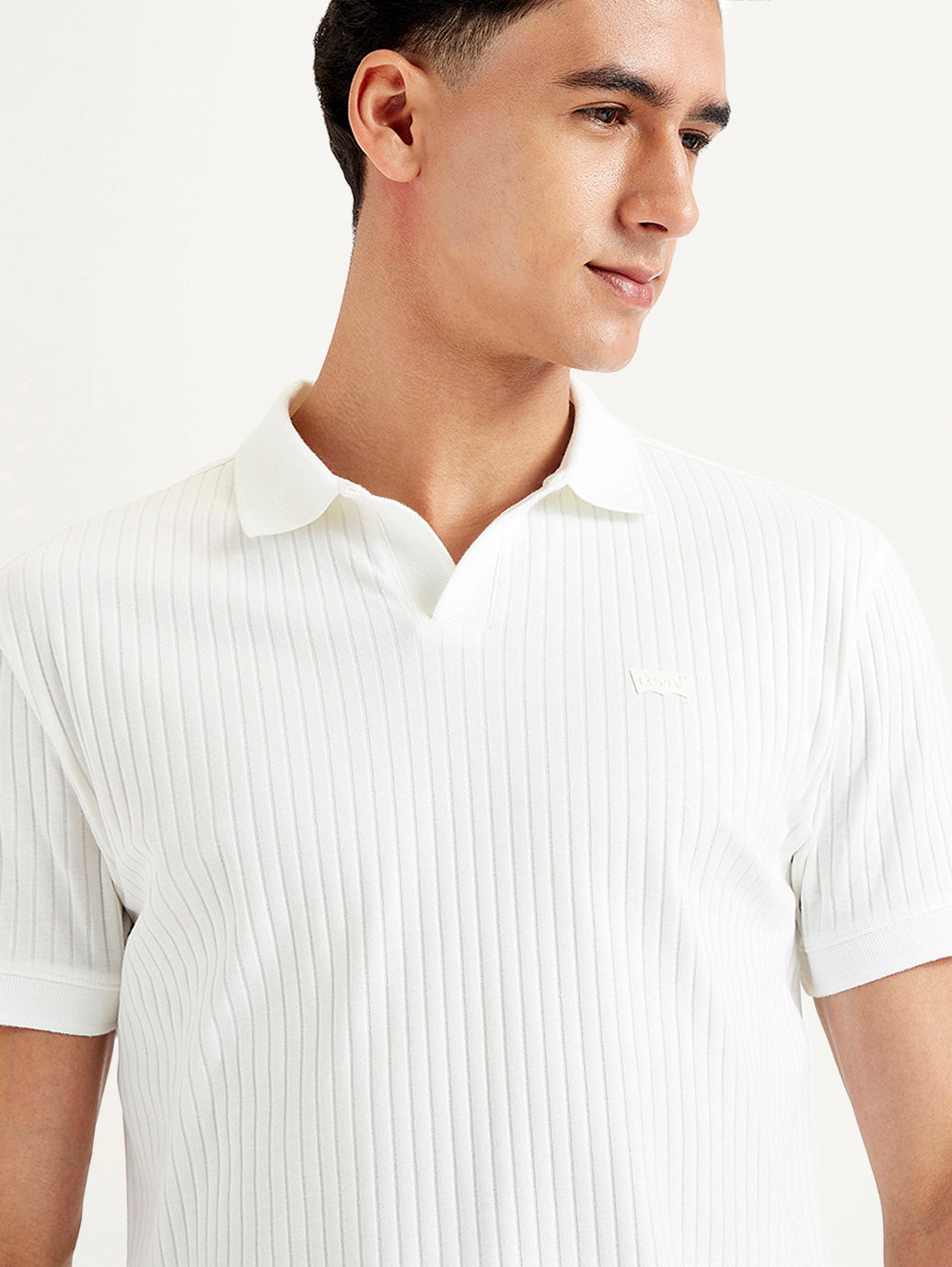 Blending style with comfort, check out this off duty essential by Levi's. This t-shirt features a self pattern and comes in the color white. Classic polo collar neck and half sleeves.