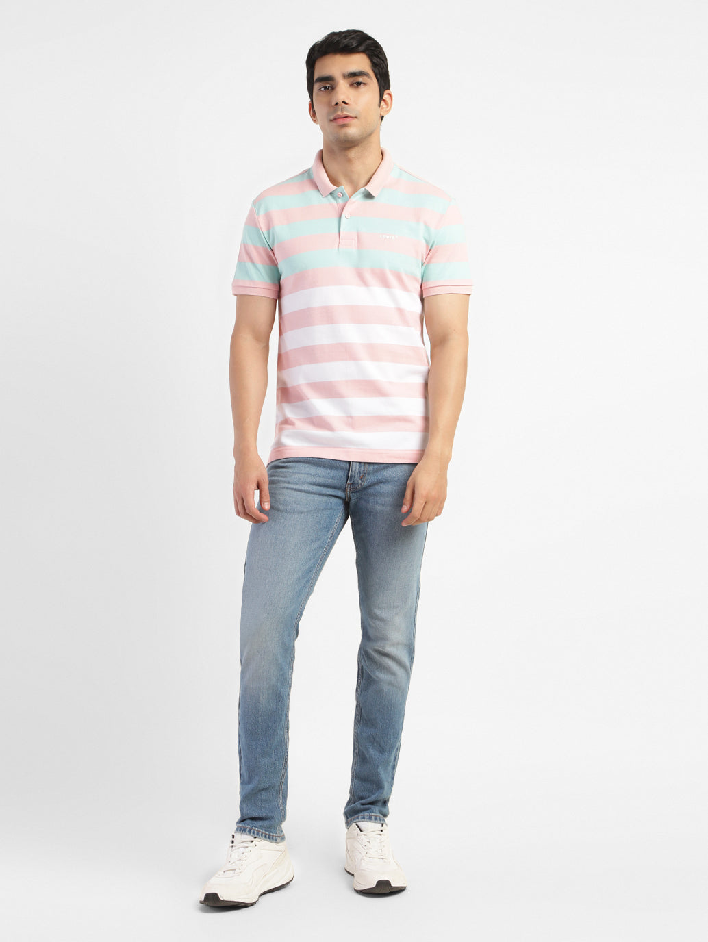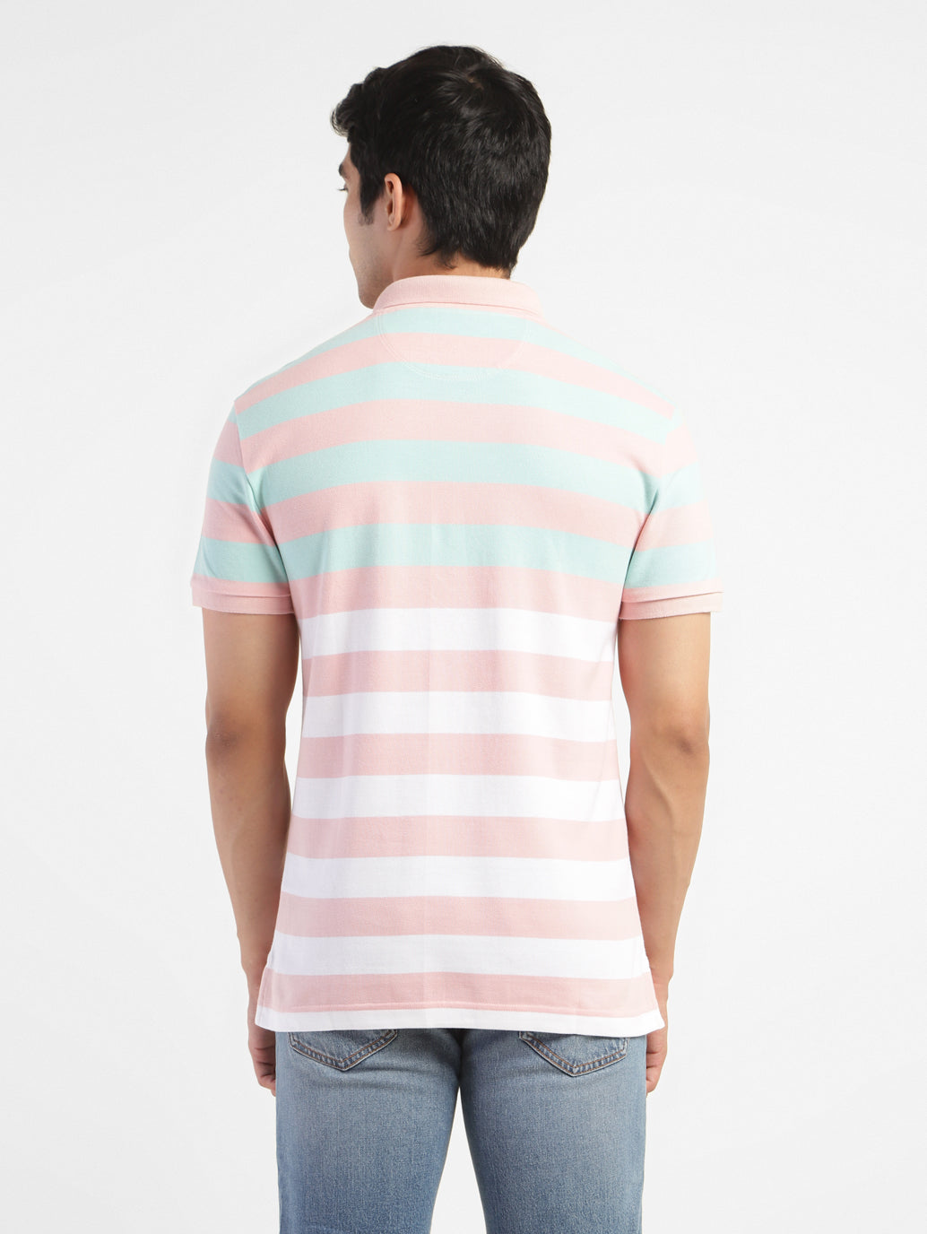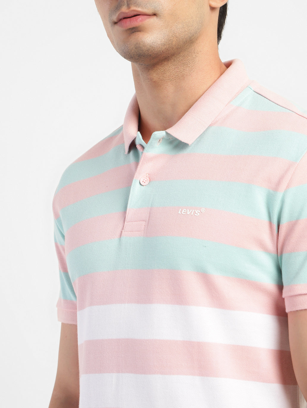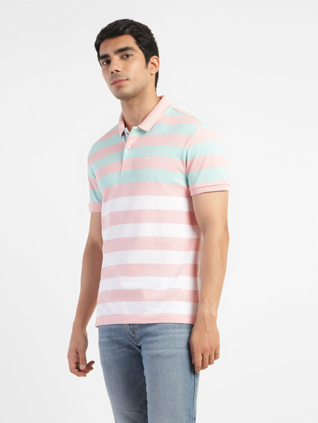Take your style to new heights of comfort with Levi's. A casual workwear and weekend favorite, this pink t-shirt is made of durable cotton fabric and features a striped pattern. The easy-to-wear collar and details add a laidback edge to this everyday essential. 1. Classic polo collar 2. Short sleeves 3. Versatile regular fit t-shirt More than 140 years after inventing the blue jean, one thing is clear: Levi's clothes are loved by the people who wear them - from presidents to movie stars, farmers to fashion icons, entrepreneurs to everyman. 'Live in Levi's' asserts with confidence and pride that Levi's clothes are indeed for everybody who's not just anybody.