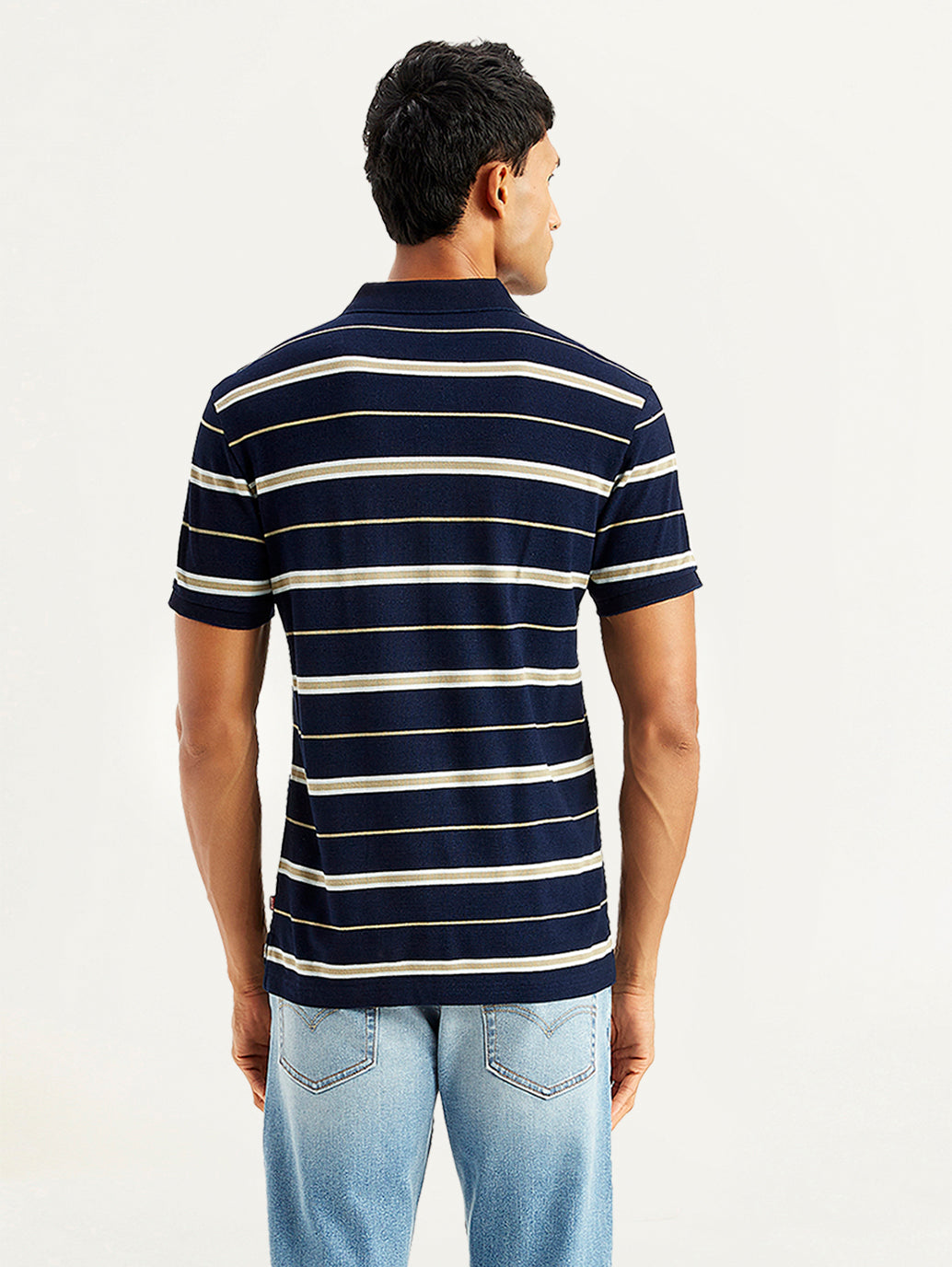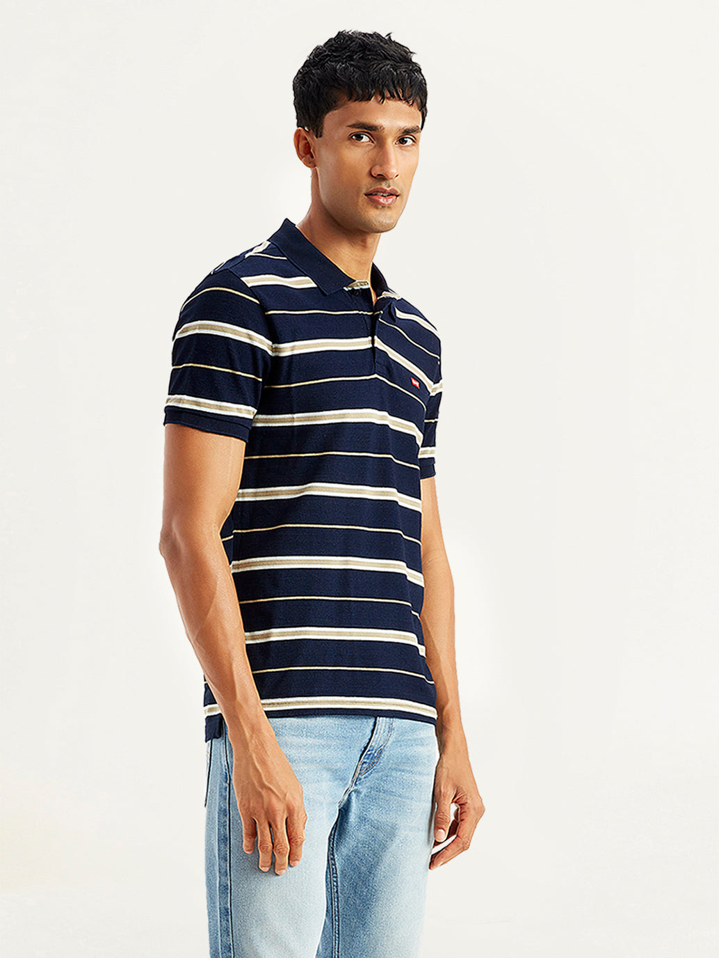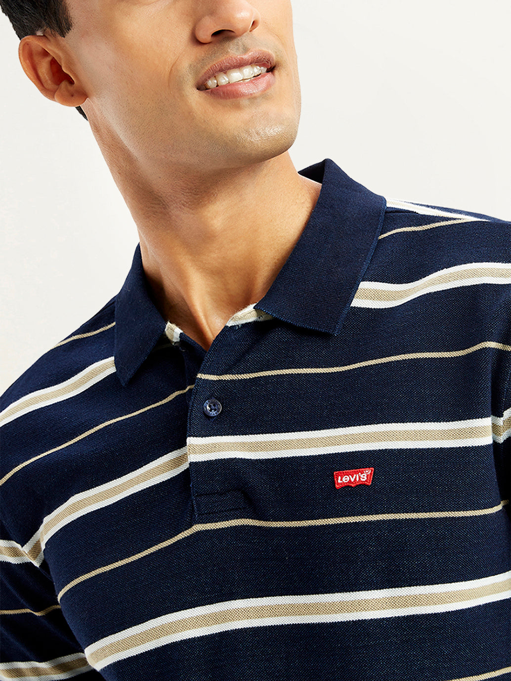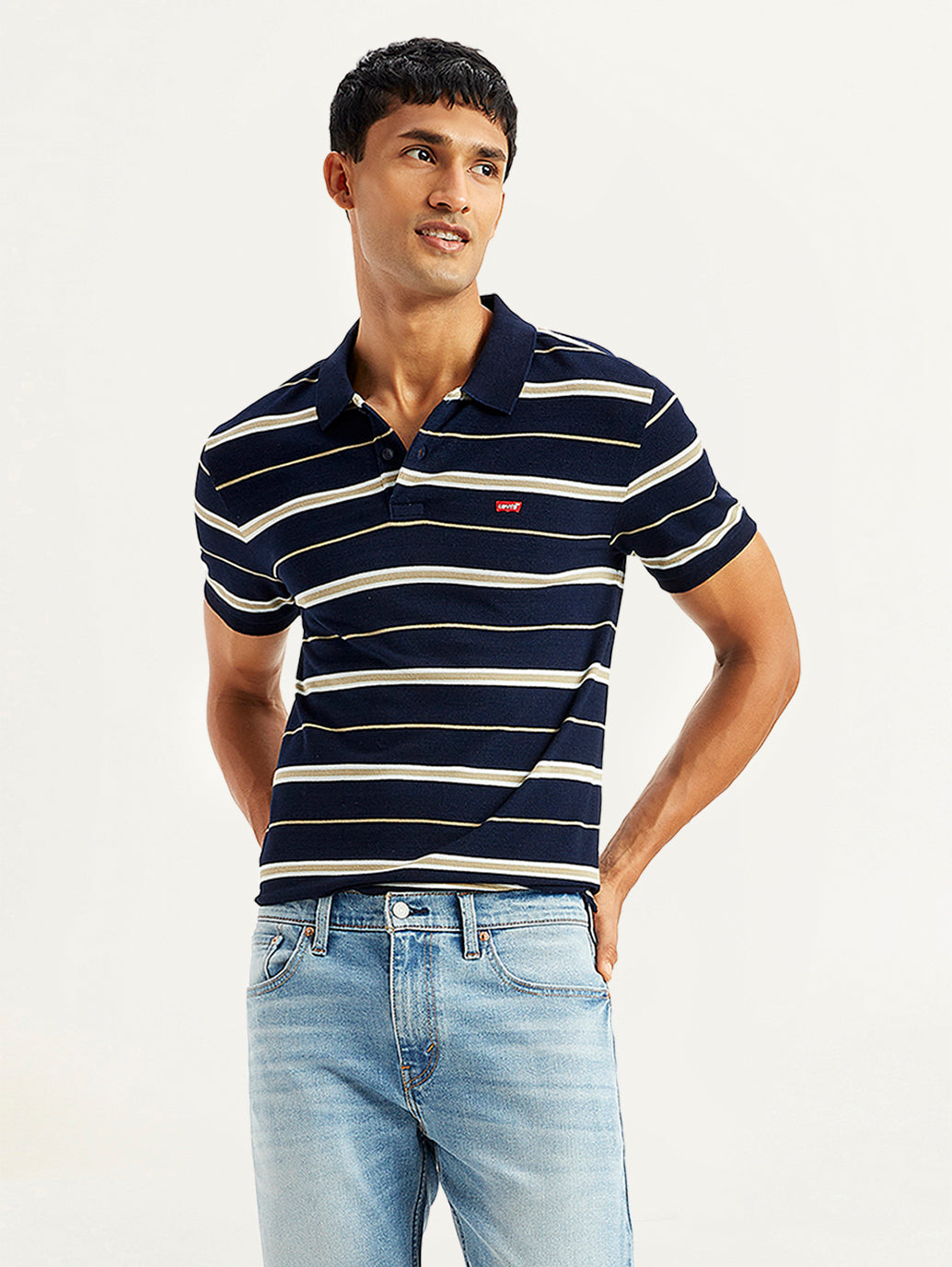 Step up your game and grab this latest t-shirt by Levi's for your wardrobe rotation. Ideal to wear with your jeans, shorts, or even your chinos, this navy cotton t-shirt is designed to be versatile. Standard polo collar and half sleeves in slim fit.