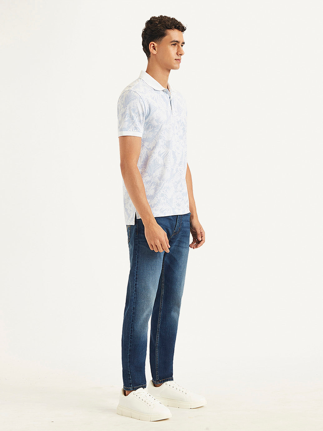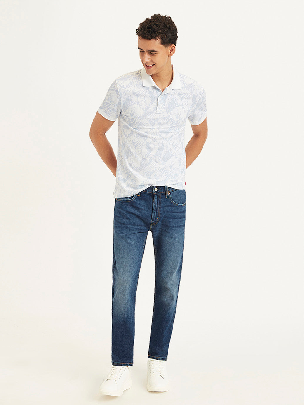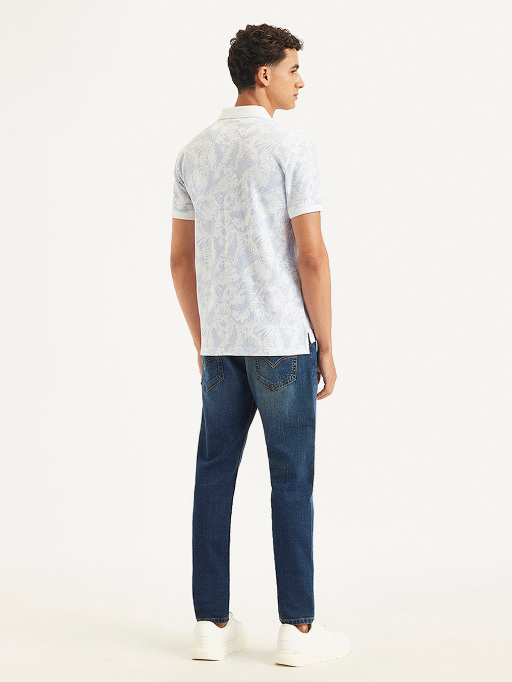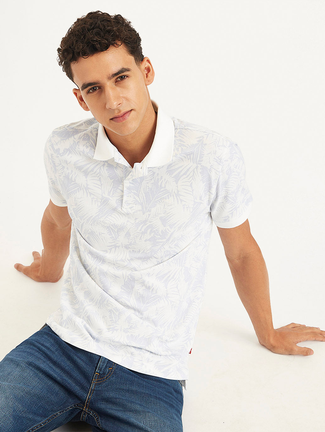 Blending style with comfort, check out this off duty essential by Levi's. This t-shirt features a tropical pattern and comes in the color white. Classic polo collar neck and half sleeves.