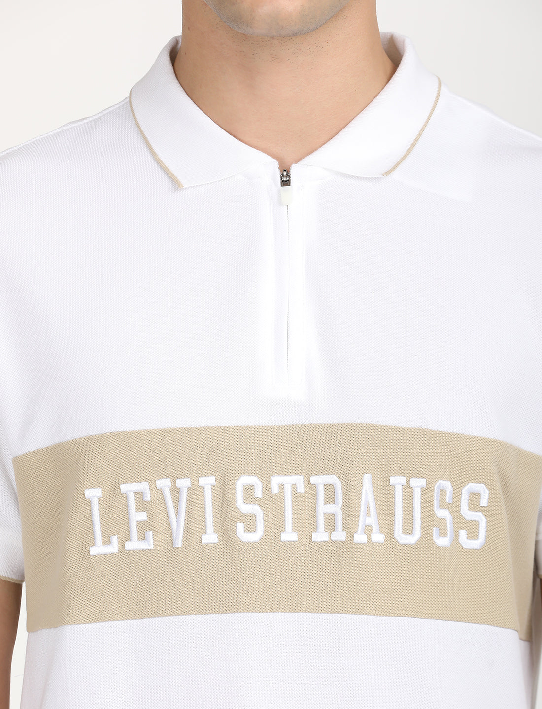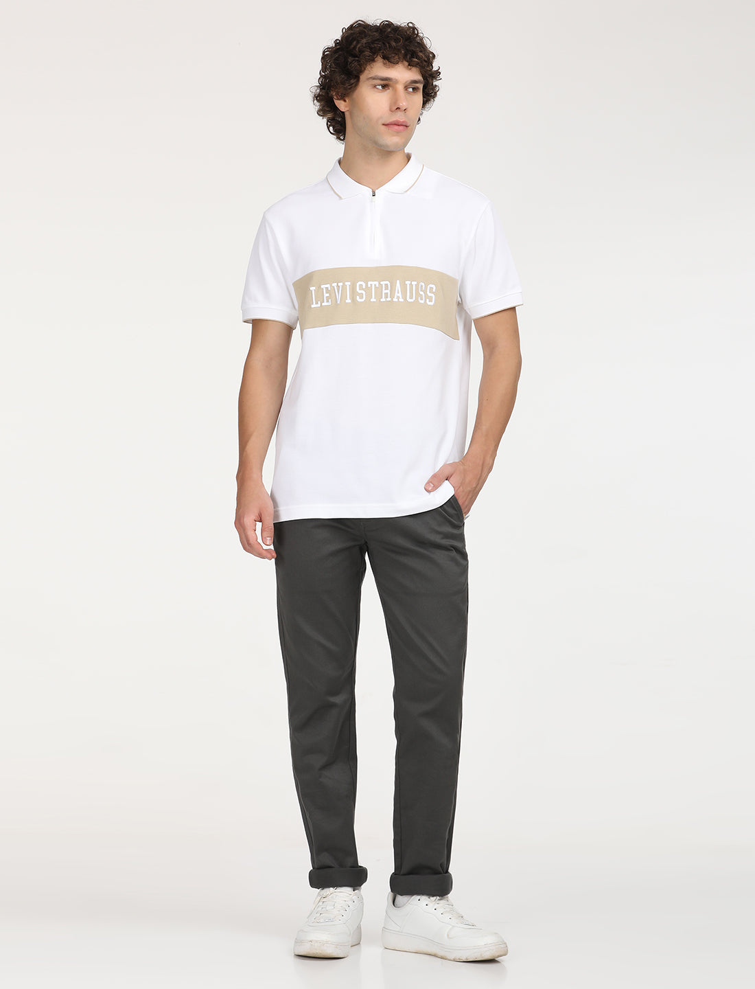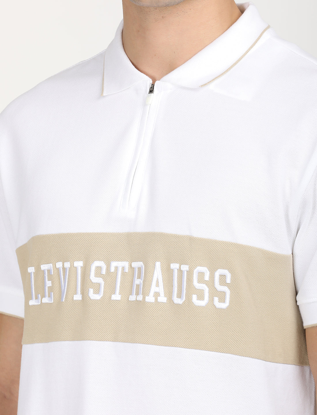 Made from good quality cotton, this easygoing Levis white T-shirt is perfect to add to your casual collection. Features a polo collar and a brand logo pattern.