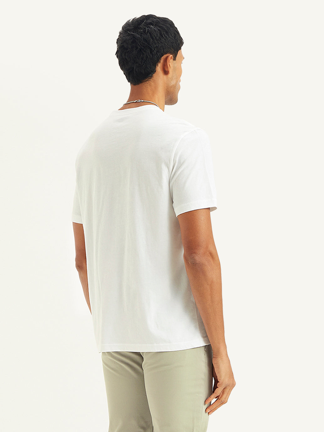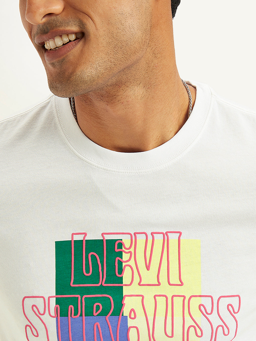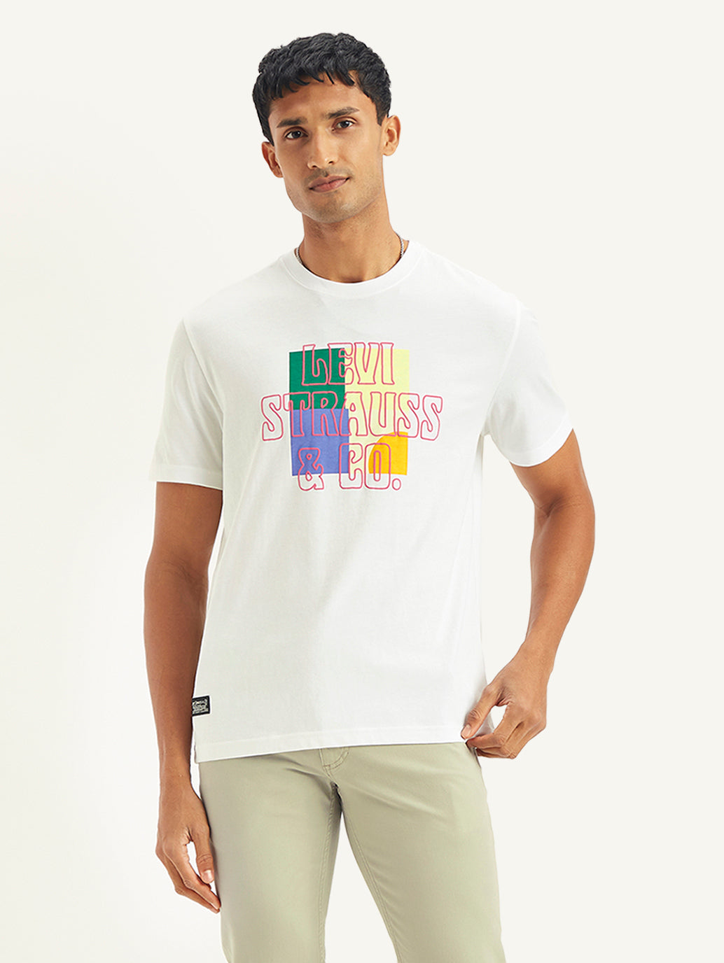 Blending style with comfort, check out this off duty essential by Levi's. This t-shirt features a graphic pattern and comes in the color white. Classic crew neck and half sleeves.