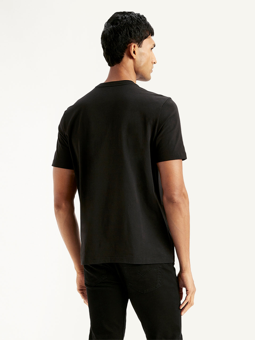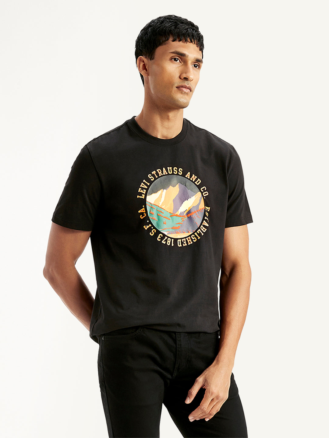 Blending style with comfort, check out this off duty essential by Levi's. This t-shirt features a graphic pattern and comes in the color black. Classic crew neck and half sleeves.