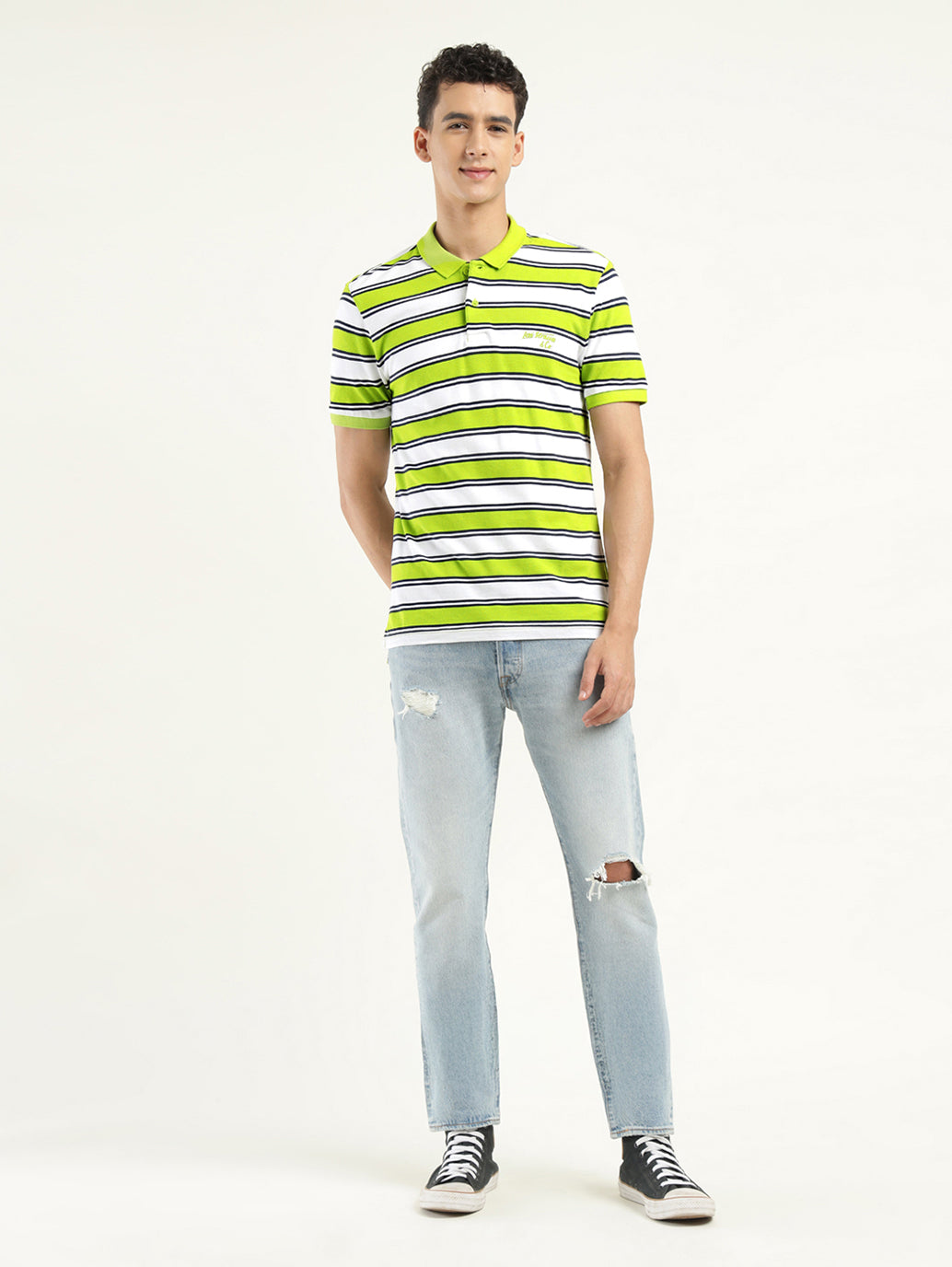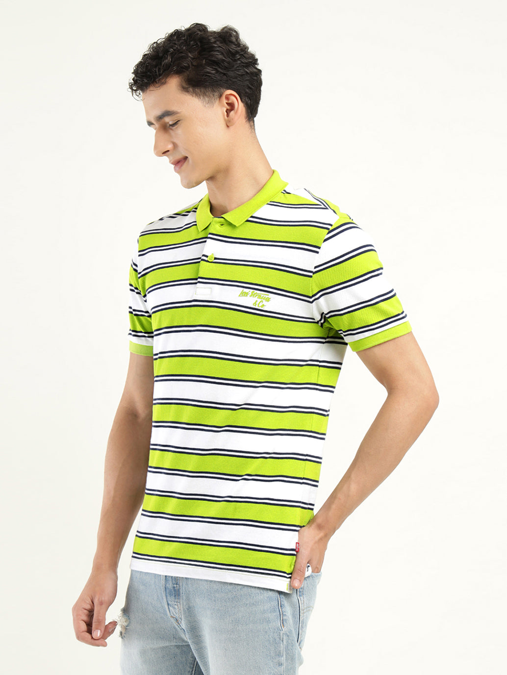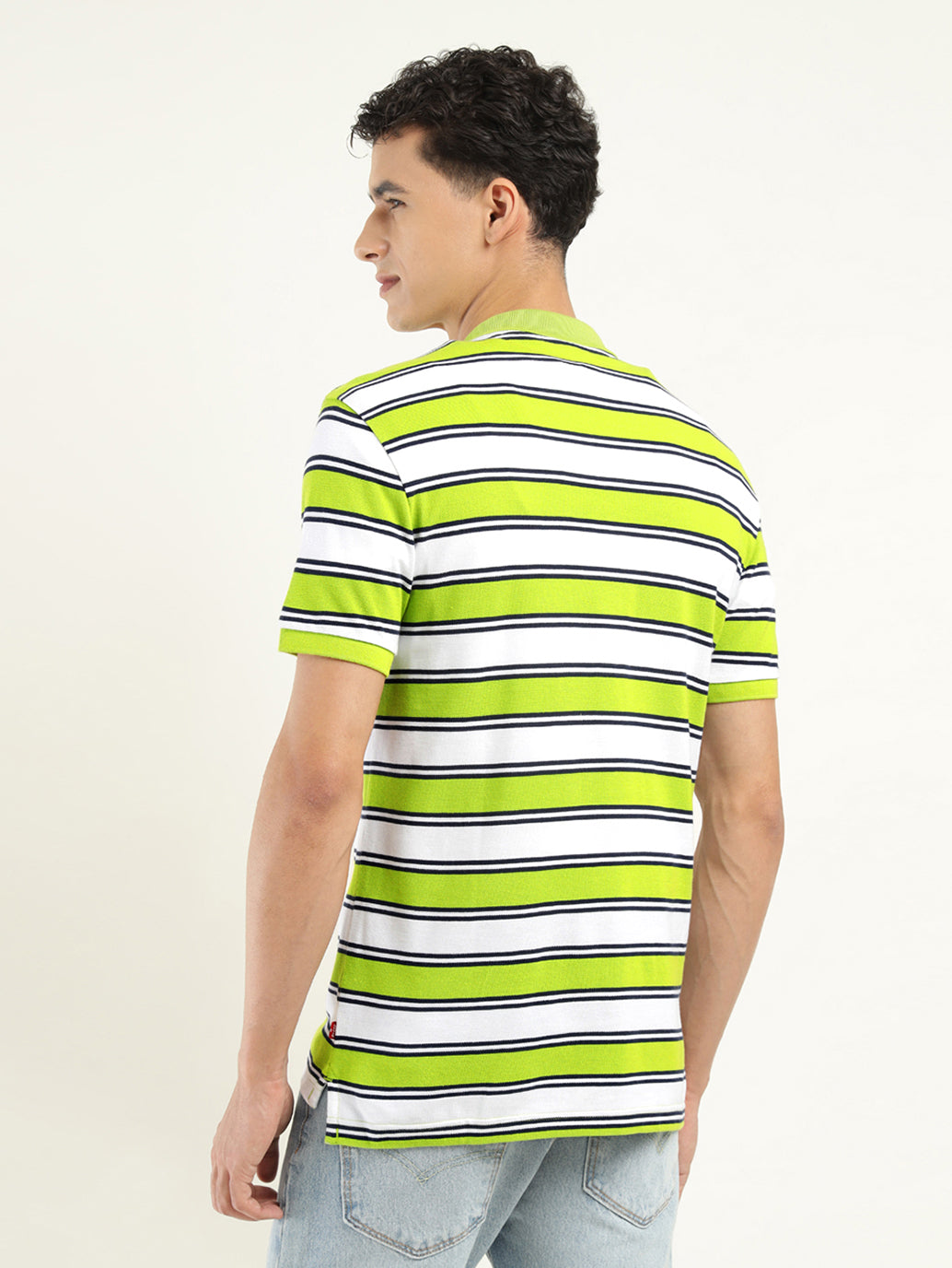 1. Features a polo collar and a striped pattern
