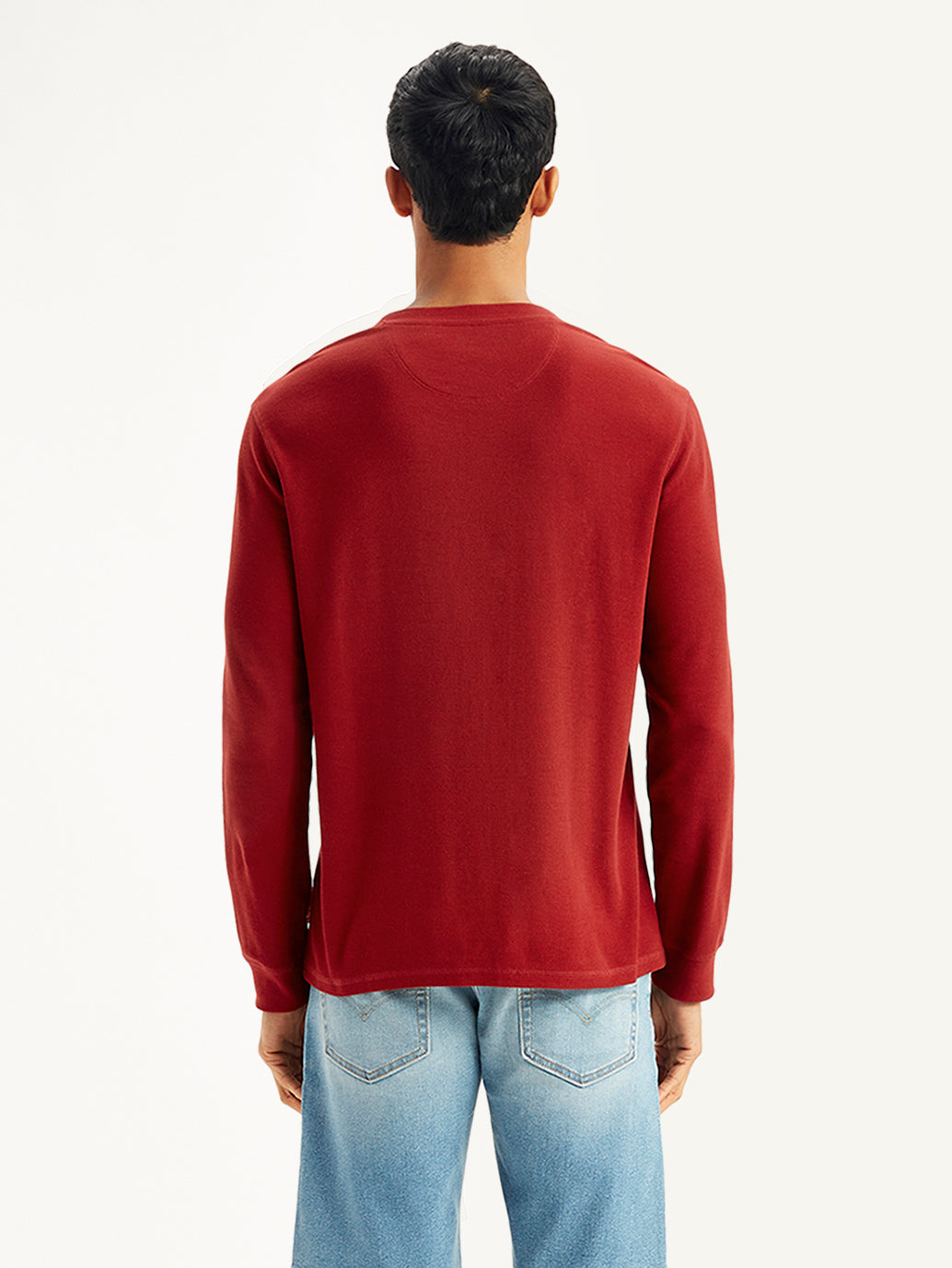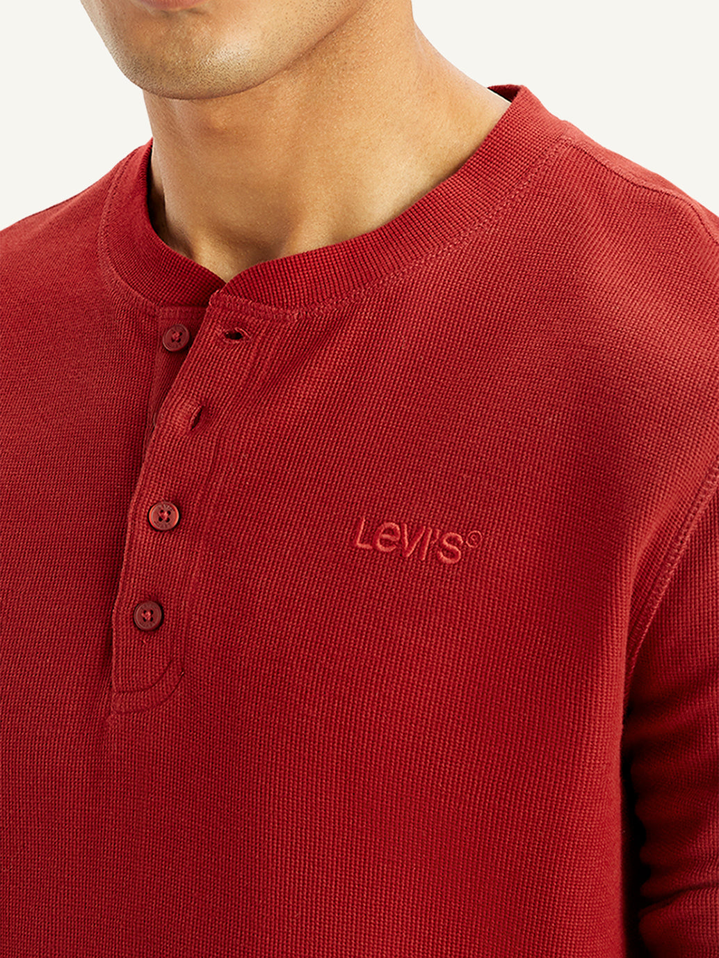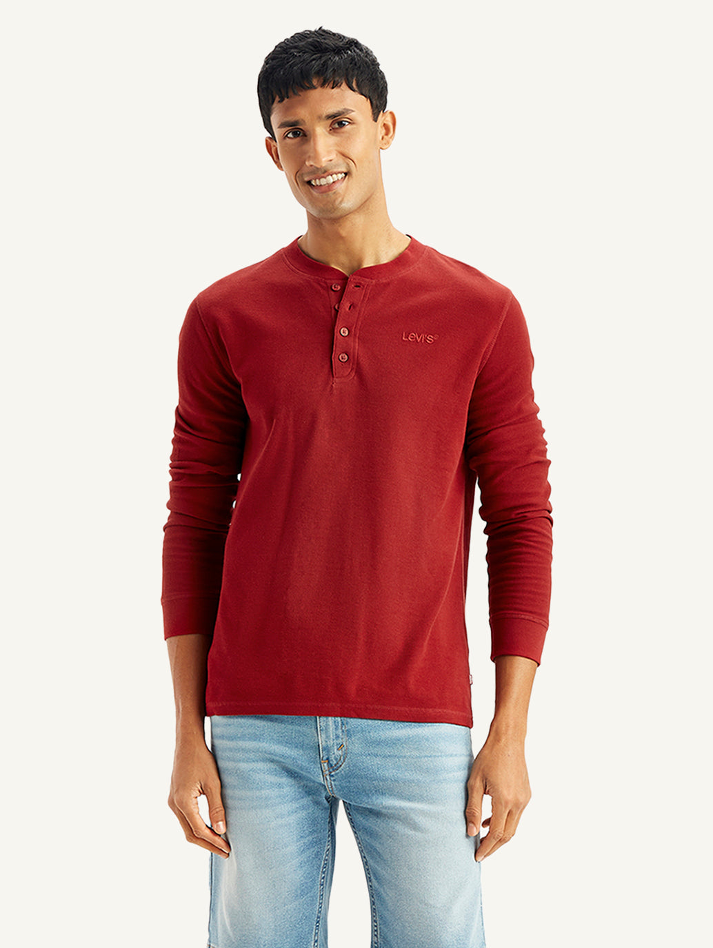 Made from good quality cotton, this easygoing Levis maroon t-shirt is perfect to add to your casual collection. Features a henley neck and a textured pattern.