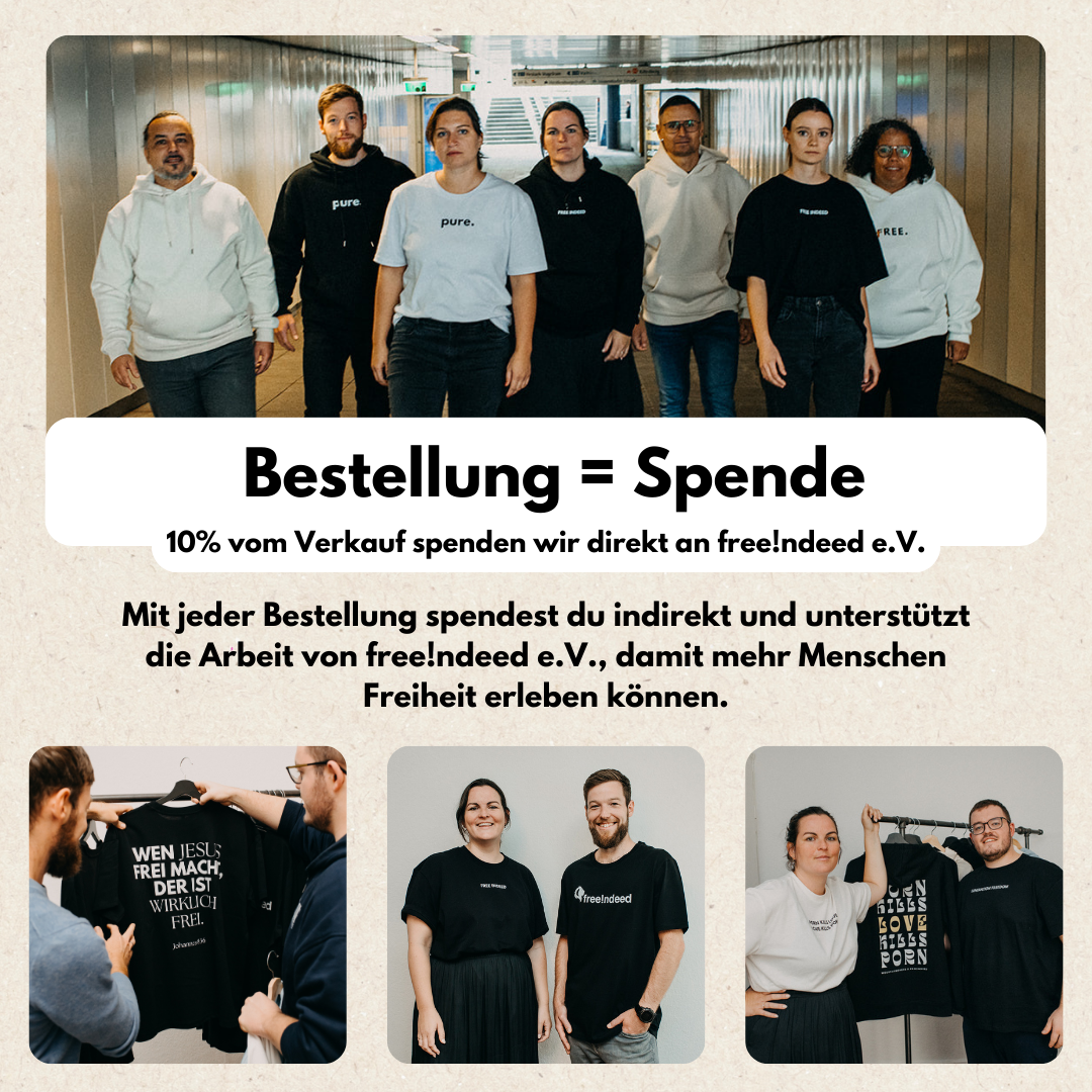 In einer Welt voller Gebundenheiten glauben wir an ganzheitliche Freiheit, mit der Jesus uns beschenken möchte. Zu oft halten uns Dinge gefangen und hindern uns daran, das Leben in Freiheit zu führen, zu dem wir berufen sind. Dieses Shirt, entstanden in Kooperation mit free!ndeed, setzt ein starkes Statement gegen die Fesseln der Pornografie und für ein Leben in echter Begegnung und authentischer Liebe.