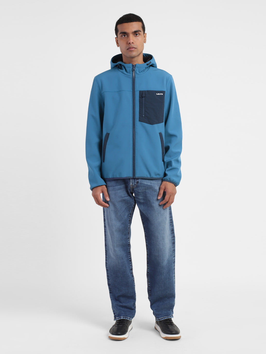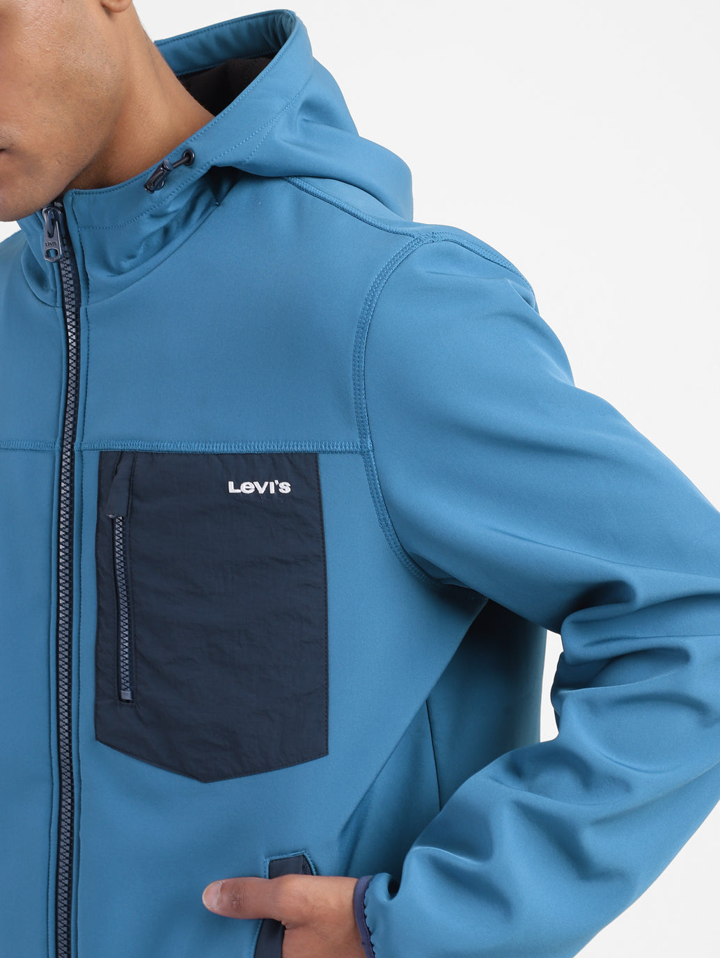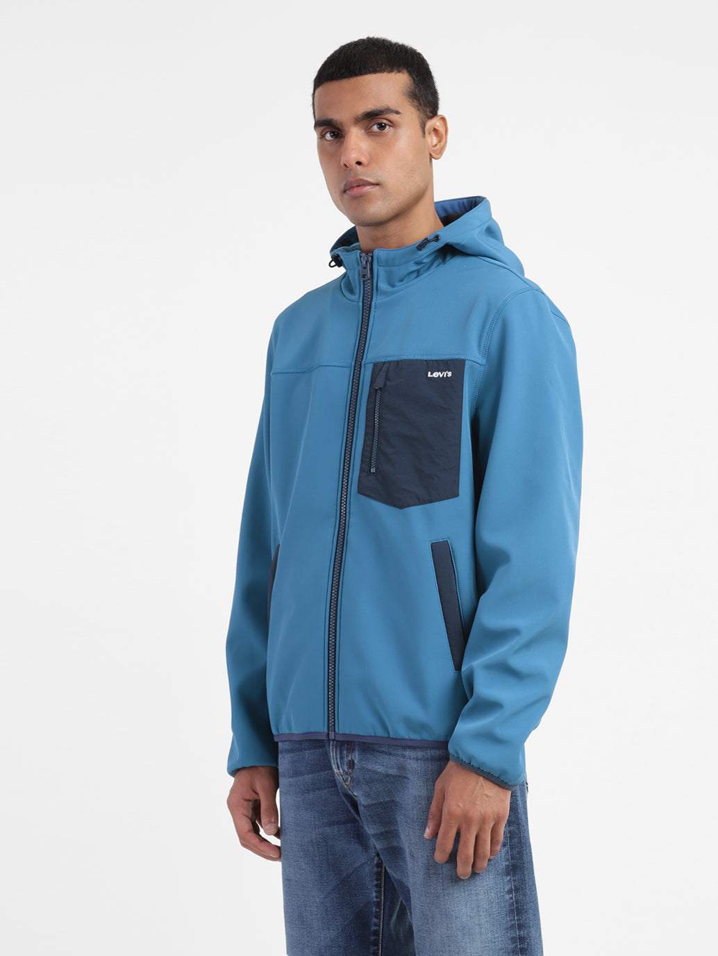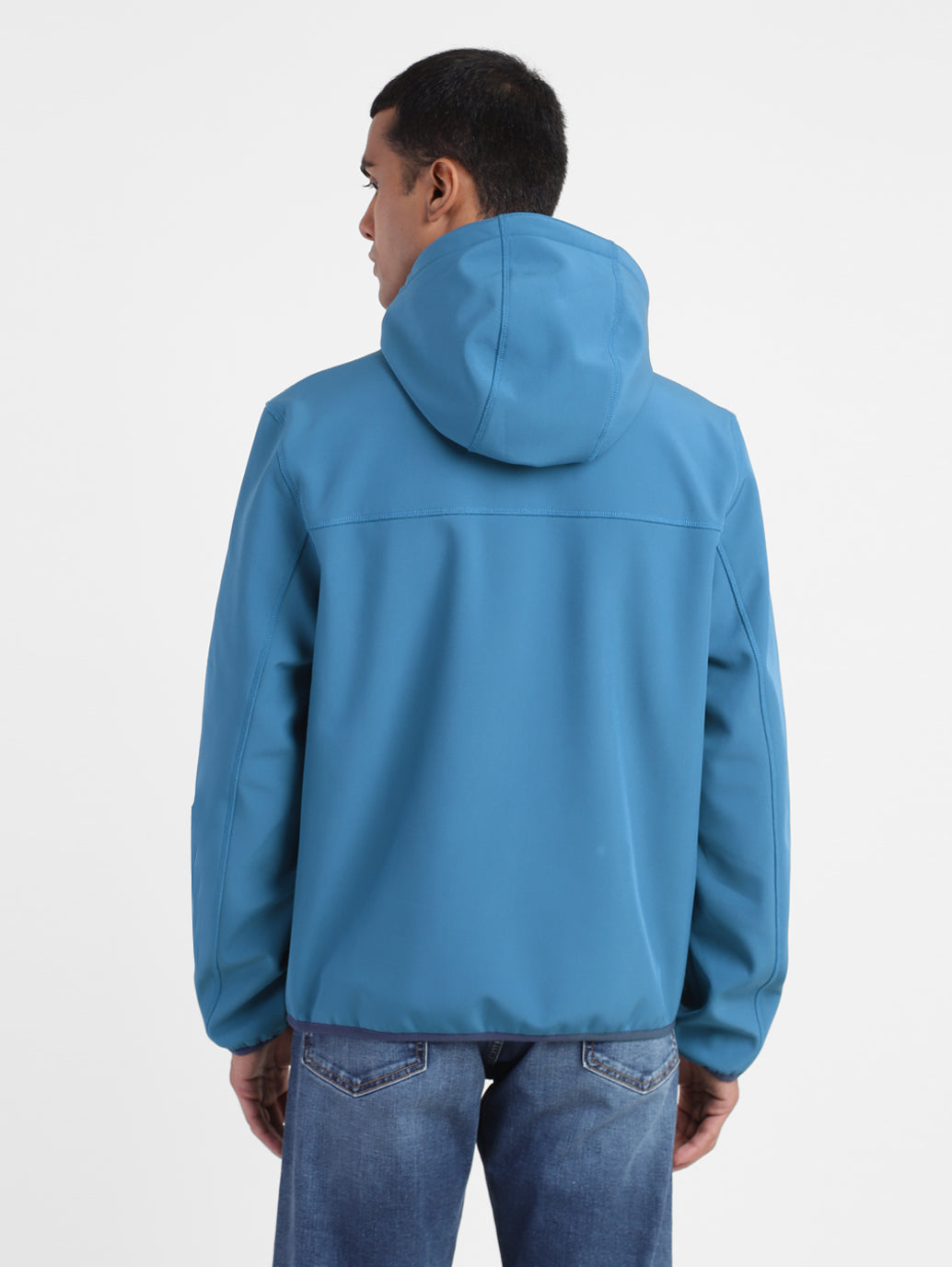 Upgrade your casual wear collection by opting for this trendy Levi's庐Men's Hooded Jacket. The solid pattern of this blue jacket makes it a must-have. Made from durable softshell material, this full sleeves jacket features a comfy regular fit.